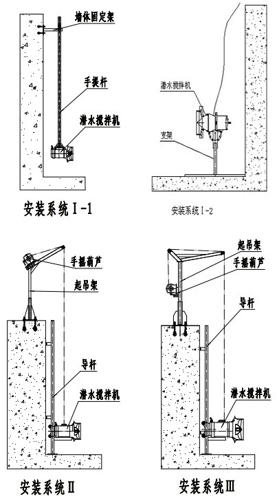 當池深H<4米時建議采用安裝系統(tǒng)一。潛水攪拌機的潛水深度可以根據需要進行垂直方向的調節(jié),而且在水平賣弄內可繞導桿旋轉的最大角度為正負60°起吊系統(tǒng)底座、支撐架和下托架與池的有關連接面均采用膨脹螺栓固定,無需預留孔。安裝系統(tǒng)二用導向鋼繩替代導桿,具有運輸方便,現(xiàn)場安裝簡單等特點。該系統(tǒng)從根本避免了由于運輸引起導桿彎曲的、變形從而影響正常使用的情況,并有效改善了池深過深情況下,由于導桿的安裝誤差而導致的無法正常起吊等現(xiàn)象。在有懸臂池頂?shù)陌惭b條件下更顯得操作方便可靠。